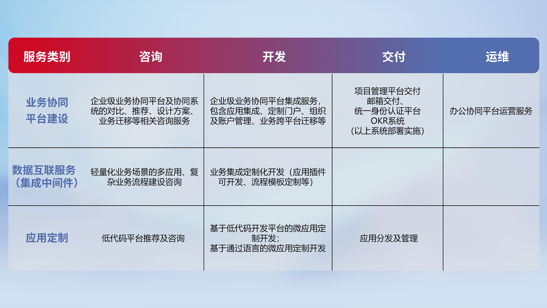 针对钉钉、、、企微、、、IDaas等平台级产品提供产品的规划、、、方案、、、、交付、、定制化开发等服务,,,实现如统一协同办公、、、、智能客户服务、、混合会议管理、、智能数据查询、、、等业务场景,,,,实现数字化转型。。。。
